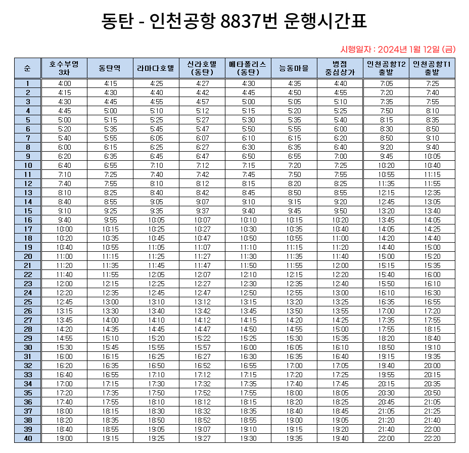 리무진버스의 운행 시간은 매우 유연하게 운영되고 있습니다. 첫차는 오전 4시부터 시작하여, 마지막 차는 저녁 8시 20분까지 운행됩니다. 배차 간격은 약 15분에서 30분으로, 여행 계획에 맞춰 편리하게 이용할 수 있습니다. 아래의 이미지는 8837번 리무진버스의 상세 시간표를 보여줍니다.
