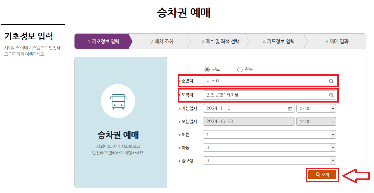 출발지와 도착지, 버스 탑승 날짜와 탑승 인원 수를 입력하고 조회버튼을 눌러줍니다.