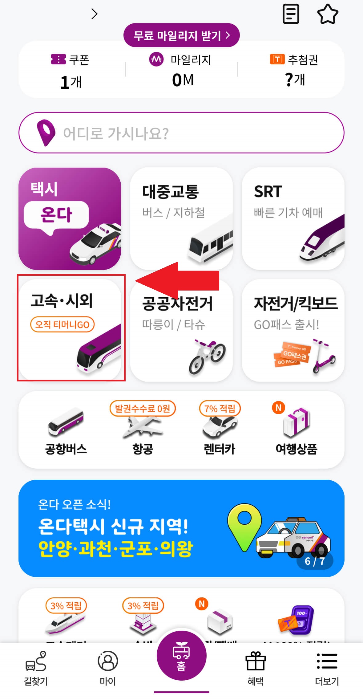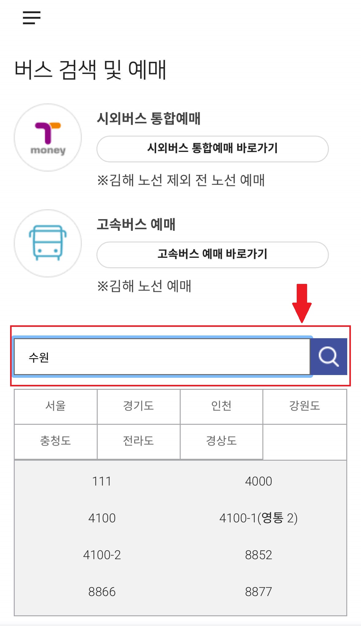 2️⃣ 어플 첫 화면에서 고속·시외버스를 선택하고, 검색창에 탑승을 원하는 지역명을 넣고 돋보기 모양을 눌러줍니다.